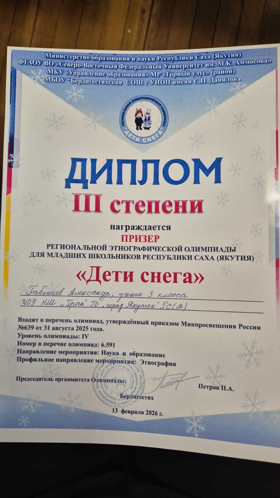 Ученик 3 класса нашей школы, Габышев Александр, достойно представил учебное заведение на региональном этапе этнографической олимпиады среди младших школьников Республики Саха (Якутия). Мероприятие, собравшее 126 юных знатоков культуры и традиций, проходило на базе МБОУ «Бердигестяхская СОШ с УИОП им. С.П. Данилова».